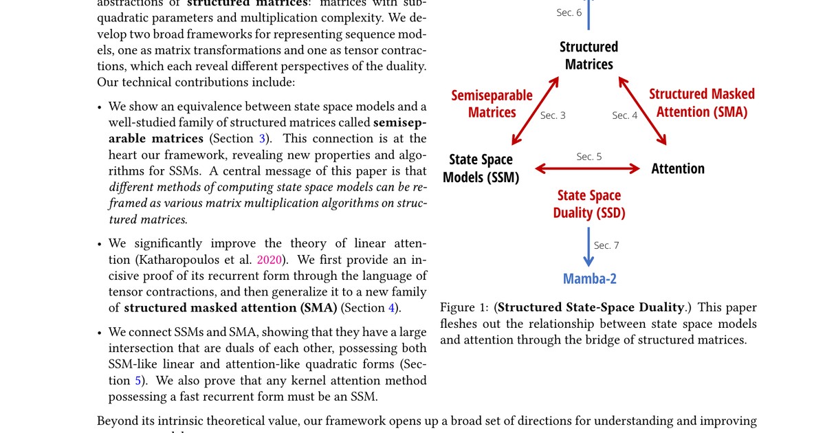 이론적 연결성 탐구: Transformer와 SSM 간의 이론적 연결성을 구조적 반분리 행렬을 통해 설명하여, 새로운 아키텍처 설계를 가능하게 했습니다.