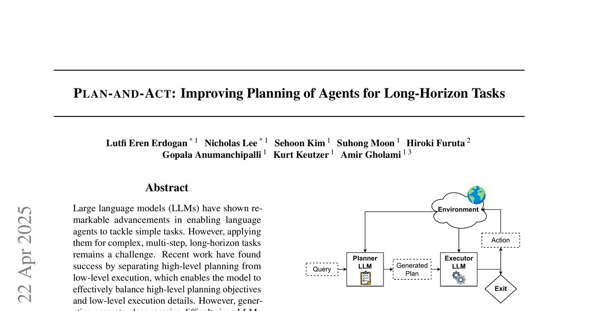 본 논문에서는 대형 언어 모델(LLM) 기반 에이전트가 복잡하고 장기적인 작업을 수행하는 데 어려움을 겪는 문제를 해결하기 위해 Plan-and-Act라는 새로운 프레임워크를 제안한다. Plan-and-Act는 고수준 계획을 생성하는 Planner 모델과 이를 실행하는 Executor 모델로 구성되어 계획과 실행을 분리하고, 합성 데이터 생성 방법을 통해 Planner 모델의 일반화 능력을 향상시킨다. 웹 탐색 환경에서 실험한 결과, WebArena-Lite 벤치마크에서 57.58%의 성공률을, WebVoyager에서 81.36%의 성공률을 기록하며 기존 모델 대비 뛰어난 성능을 입증했다. Plan-and-Act는 LLM 기반 에이전트의 장기 작업 수행 능력을 향상시키는 데 기여하며, 로봇 제어, 자율 주행 등 다양한 분야에 적용될 수 있을 것으로 기대된다. 이 연구는 계획과 실행의 분리, 합성 데이터 생성, 그리고 명확한 지침 제공이라는 세 가지 핵심 전략을 통해 LLM 에이전트의 성능을 극대화하는 새로운 방향을 제시한다.