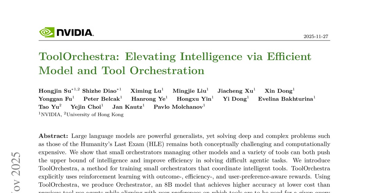 ToolOrchestra는 대형 언어 모델(LLM)의 한계를 극복하기 위해 다양한 도구와 모델을 효율적으로 조율하는 작은 오케스트레이터 모델을 제안합니다. 이 방법론은 강화 학습을 통해 도구 사용 정책을 최적화하여 정확성, 효율성, 사용자 선호도에 기반한 결과를 제공합니다. ToolOrchestra는 LLM의 한계를 극복하고 다양한 도구를 활용하여 더 높은 지능과 효율성을 달성할 수 있음을 보여줍니다. 특히, Orchestrator 모델은 GPT-5를 능가하는 성능을 보이며, 비용 효율성에서도 뛰어난 결과를 제공합니다. 본 논문은 2025년에 발표되었으며, LLM의 활용 방안에 대한 새로운 시각을 제시합니다.