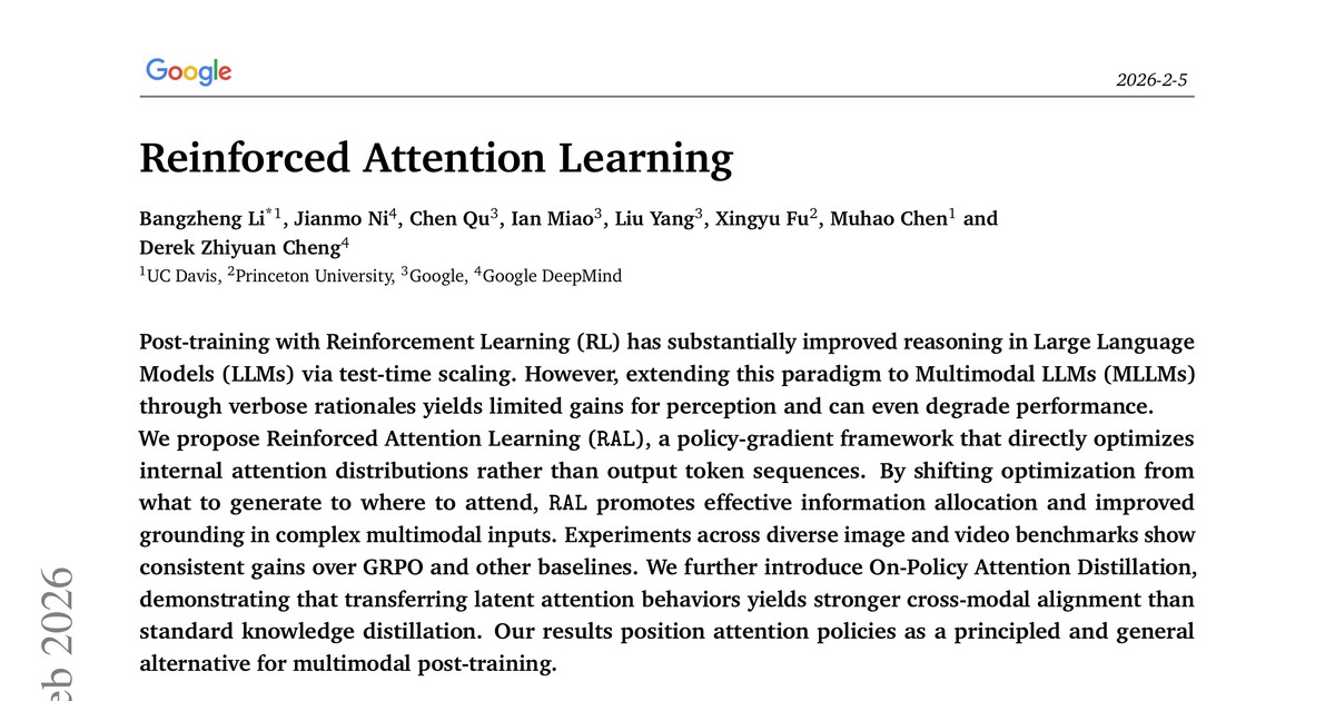 멀티모달 대형 언어 모델(MLLM)은 텍스트와 이미지를 넘나들며 놀라운 성능을 보여주고 있습니다. 그러나 복잡한 이미지나 비디오에서 정말 중요한 정보가 무엇인지 파악하고 집중하는 데는 여전히 어려움을 겪습니다. 이 문제를 해결하기 위해 **강화 주의 학습(Reinforced Attention Learning, RAL)**이라는 새로운 튜닝 패러다임을 제안합니다. RAL은 모델의 최종 '답변'이 아닌, 답변을 만들어내는 내부 '과정'인 주의(Attention) 메커니즘을 직접 최적화합니다. 이를 통해 모델은 더 효과적으로 정보의 우선순위를 정하고, 답변의 근거를 정확히 찾아내는 능력을 기릅니다. 다양한 이미지 및 비디오 벤치마크에서 기존 방법론보다 일관된 성능 향상을 보였으며, 더 똑똑하고 신뢰할 수 있는 MLLM으로 나아가는 중요한 열쇠가 될 수 있습니다.