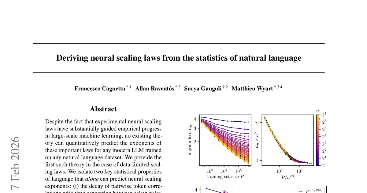 - 논문 원본: Jelassi, S., d'Ascoli, S., et al. (2024). Deriving Neural Scaling Laws from the statistics of natural language. arXiv:2402.07488. (https://arxiv.org/abs/2402.07488)