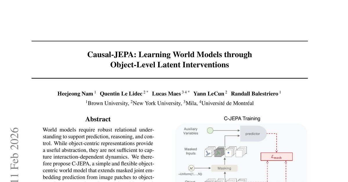 - 논문 원문 (arXiv): Causal-JEPA: Learning World Models through Object-Level Latent Interventions