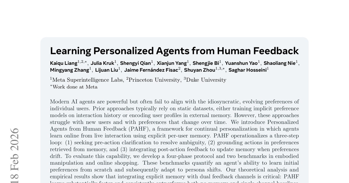 본 연구는 이러한 문제를 해결하기 위해 PAHF (Personalized Agents from Human Feedback) 프레임워크를 제안합니다. PAHF는 사용자별 명시적 메모리와 이중 피드백 채널을 통해 에이전트가 사용자와 상호작용하며 실시간으로 학습하고, 초기 학습 오류를 줄이며, 선호도 변화에 신속하게 적응하도록 설계되었습니다.