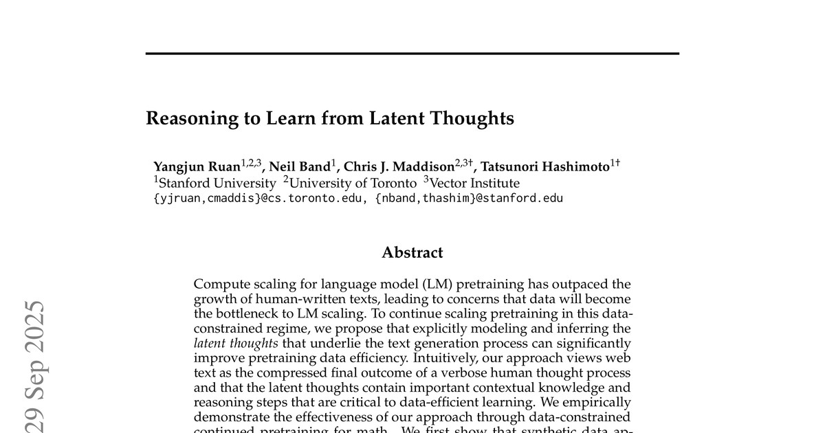 - 잠재적 사고 모델링: 텍스트 생성의 기저에 있는 잠재적 사고를 확률 모델로 정의하고, 이를 추론하여 데이터 효율성을 극대화하는 새로운 방법론을 제시했습니다.