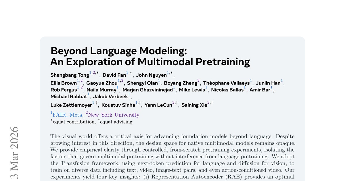 - 원본 논문: Tong, S., et al. (2026). Beyond Language Modeling: An Exploration of Multimodal Pretraining. arXiv:2603.03276. https://arxiv.org/abs/2603.03276